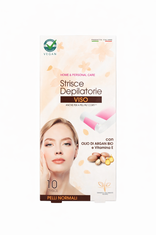 Strisce Depilatorie Viso con Olio di Argan BIO e Vitamina E – Ceretta a Freddo per Baffetti e Peli Corti – Delicate sulla Pelle, Azione Nutriente – OFFERTA 5 Confezioni da 10 Strisce (50 Totali)