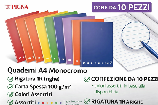 Pigna Monocromo Quaderni A4 a Righe 1R, Confezione 10 Pezzi, Carta 100 g/m² Spessa, Copertina Tinta Unita Colori Assortiti, Scuola Ufficio Appunti, Studio, Note, Made in Italy