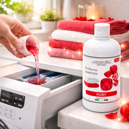 Camomilla Torino Profumo Bucato Lavatrice RUBY 500 ml Concentrato – Fragranza Intensa e Persistente per Biancheria, Ammorbidente Profumato per Lavatrice, Profumo Tessuti Lunga Durata, Bucato Fresco