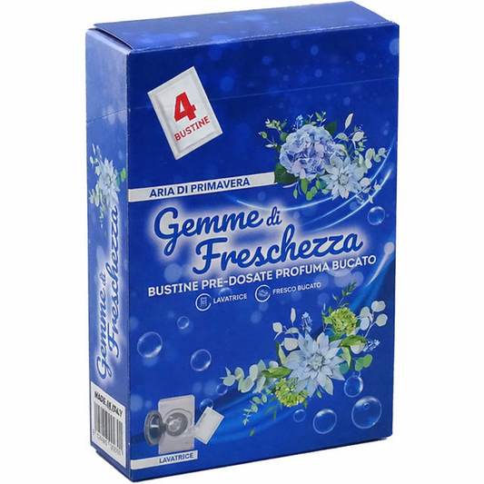 Gemme di Freschezza Profuma Bucato Lavatrice Bustine Pre-Dosate 4 Scatole (16 Bustine) Profumatore Bucato Lavatrice Lunga Durata Anti Odori Bucato Fresco Morbido Casa Pulito ARIA DI PRIMAVERA