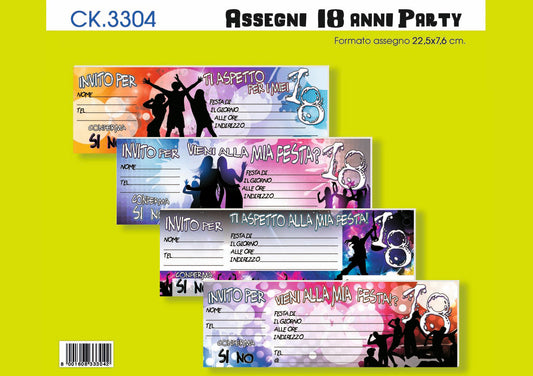 15 Inviti 18 Anni Party CK3304 – Modello Assegno – Fantasie Colorate – Formato 22,5x7,6 cm