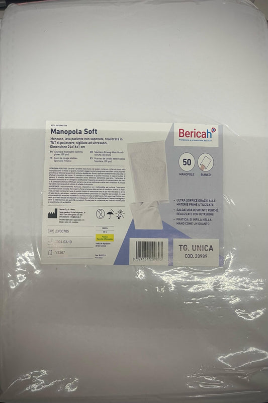 Bericah Manopole Monouso in TNT per Igiene Personale – 50 Pezzi, Bianche, Morbide e Delicate – Guanti Spugna per Lavaggio Anziani, Bambini e Neonati – Dimensioni 24x16x1 cm – Marchio