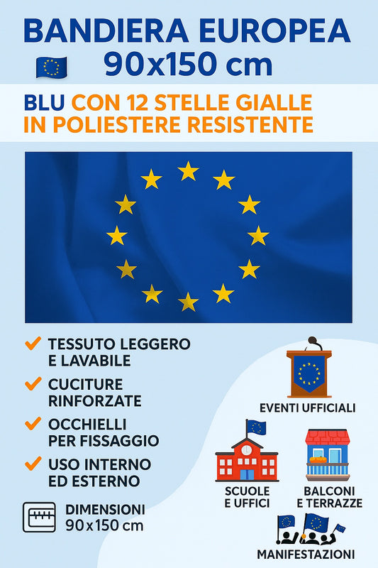 Bandiera Europea 90x150 cm – Blu con 12 Stelle Gialle in Poliestere Resistente | Occhielli per Fissaggio – Uso Interno ed Esterno | Tessuto Leggero, Lavabile, Anti-sbiadimento