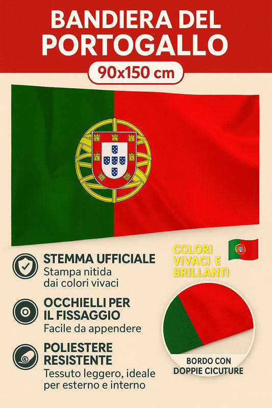 Bandiera del Portogallo 90x150 cm – Verde e Rossa con Stemma Ufficiale | Poliestere Resistente con Occhielli – Uso Interno ed Esterno