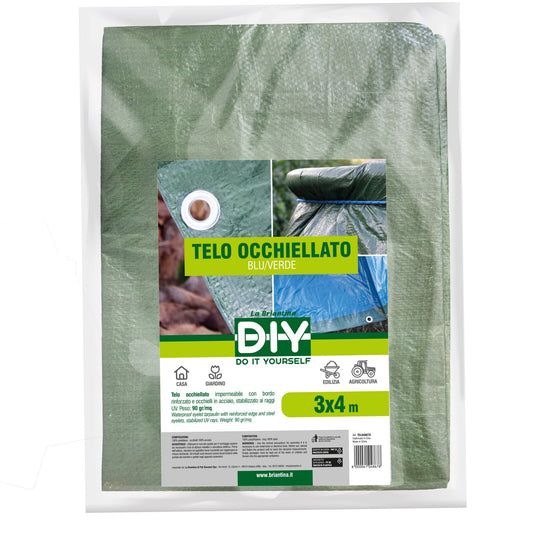Telo Occhiellato Impermeabile Blu e Verde 3x4 m – Copertura Multifunzione con Occhielli in Acciaio e Bordi Rinforzati – 90 g/m²