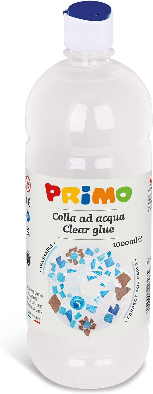 PRIMO Colla Liquida Trasparente 1kg a Base Acqua – Con Tappo Dosatore, Fissante e Ribagnabile – Ideale per Scuola e Lavoretti Creativi