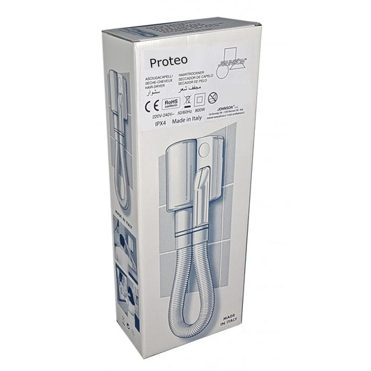 Johnson Basik Phon Asciugacapelli da Parete Professionale 800W 220V – Phon Compatto da Muro con Supporto Sicurezza, Pulsante On/Off, Ideale per Hotel, B&B, Palestre, Piscine, Spogliatoi – Design Salvaspazio