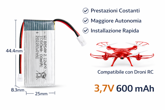 Batteria LiPo Ricaricabile 3,7V 600 mAh per Droni RC – Ricambio Universale con Connettore JST – Prestazioni Costanti e Autonomia Migliorata – Installazione Rapida – Batteria Leggera per Quadricotteri e Droni Giocattolo