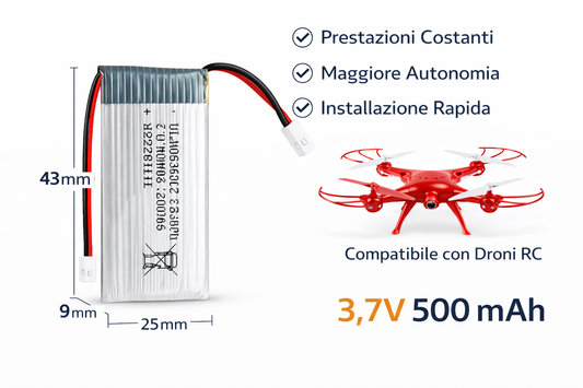 Batteria LiPo Ricaricabile 3,7V 500 mAh per Droni RC – Ricambio Universale con Connettore JST – Prestazioni Costanti e Autonomia Migliorata – Installazione Rapida – Batteria Compatta per Quadricotteri e Mini Droni